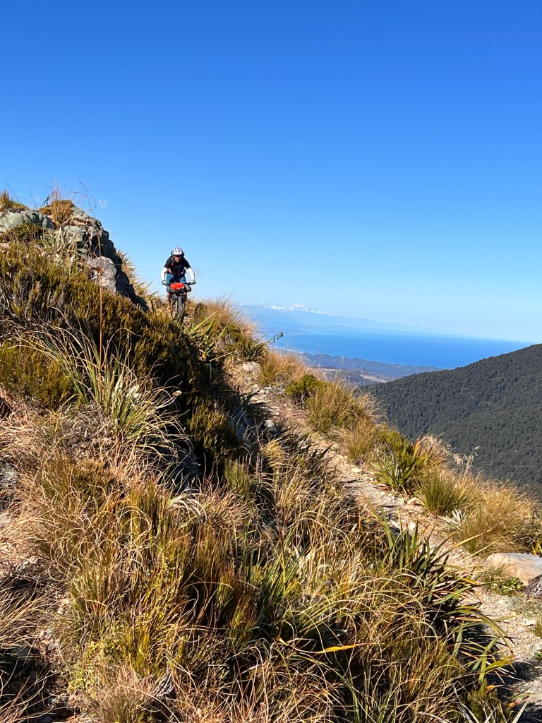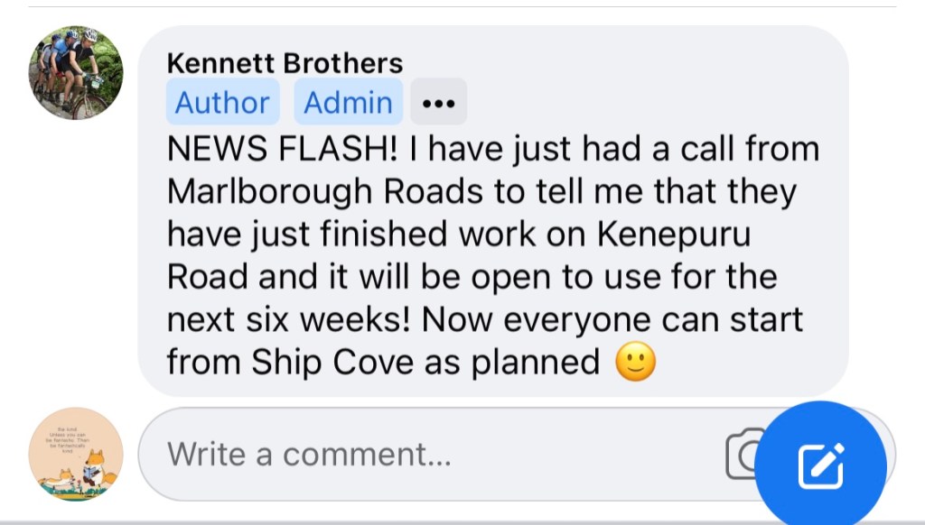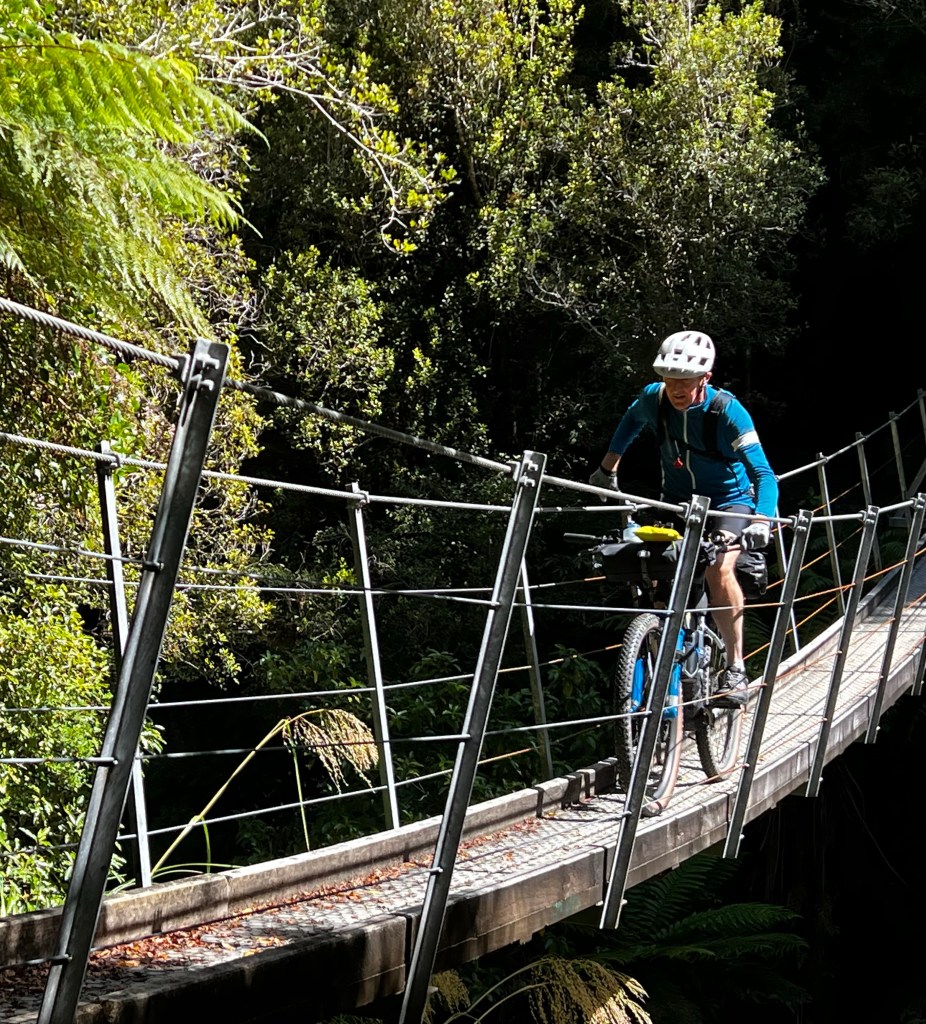 Being able to ride the road section has just made day one a LOT easier. I am relieved – had resigned myself to riding the top section but having ridden this a lot on my 20s and 30s was aware of how steep parts of this section are and the need to walk with all the gear on my bike. So now can entertain the idea of coffee at Furneaux Lodge if I feel like it and can relax into day one. Yippee!