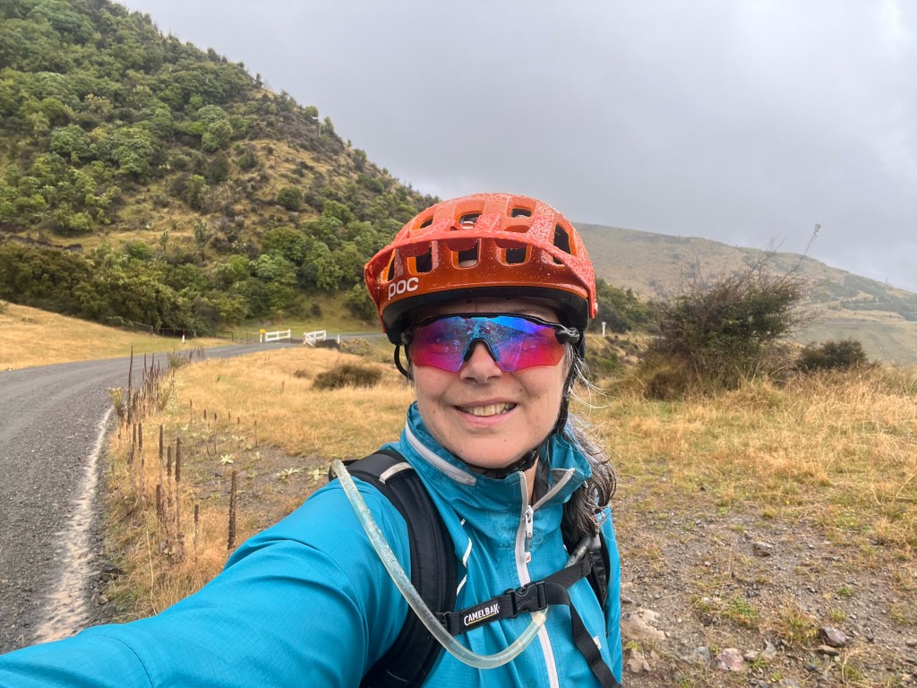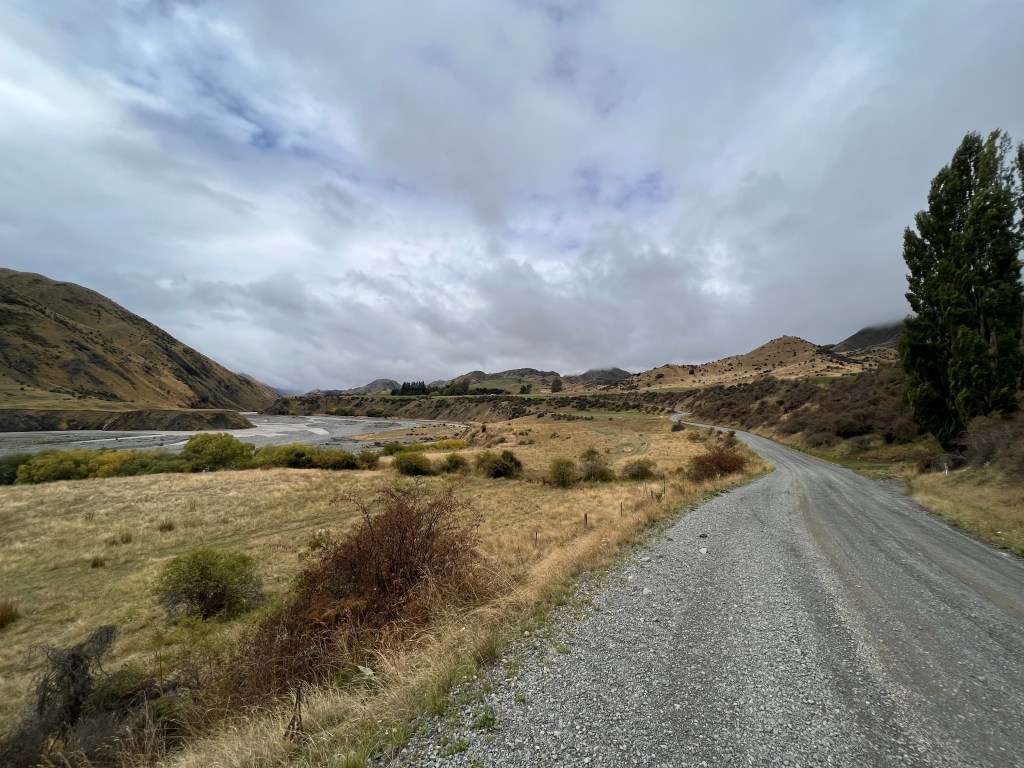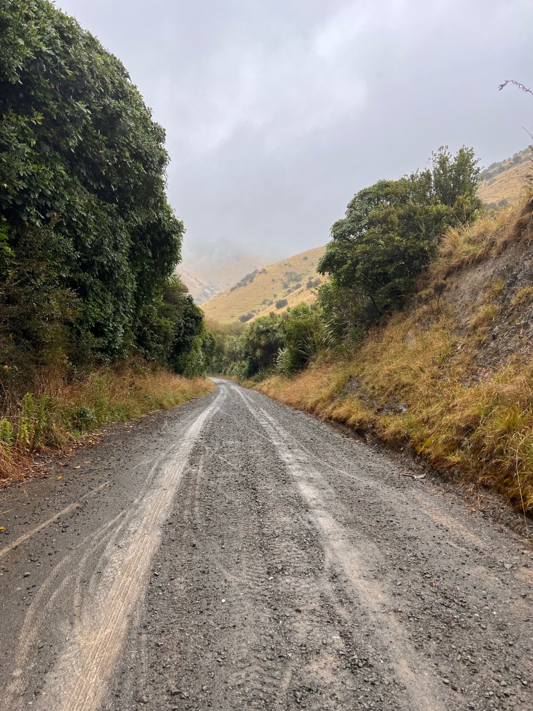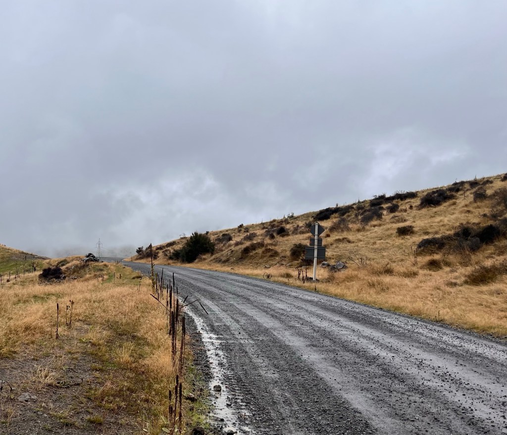After the descent off Taylor’s Pass I had to stop and wash the chain with my water bottle as there was so much mud and grit in the chain I thought it might get stuck. After a good hose down with the water bottle I dried it and oiled it – then the road thankfully turned into tarseal. Lots of water on the road but not muddy. The valley was nice – slow climb up then I got to the significant climb which turned into gravel part way up. Lots of rain on the climb but quite refreshing. The last 25km to Upcot Station was very hilly, nearly all the climbs were tarsealed then would revert to gravel. A big slip with lots of mud just before the bridge. I could see shearer’s quarters on the other side of the bridge – however green sheds and I knew I was looking for cream sheds so kept going. 2km later I arrived!