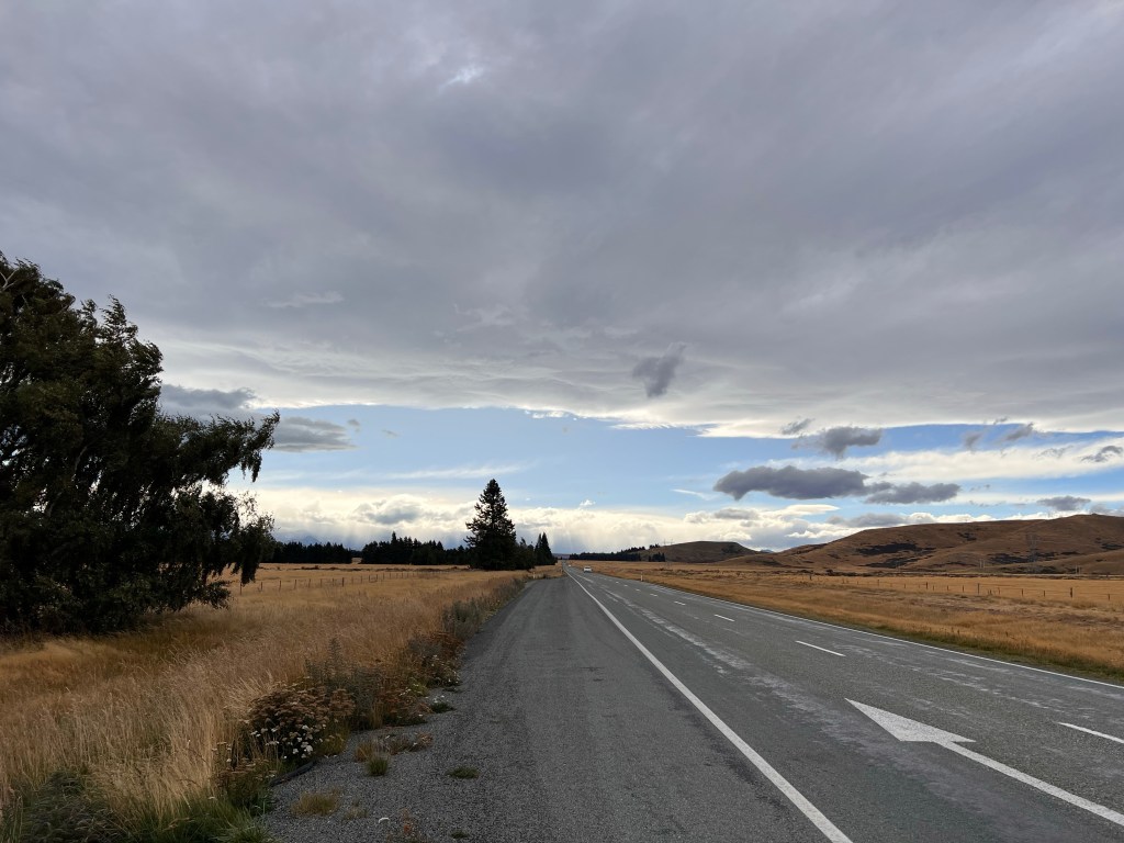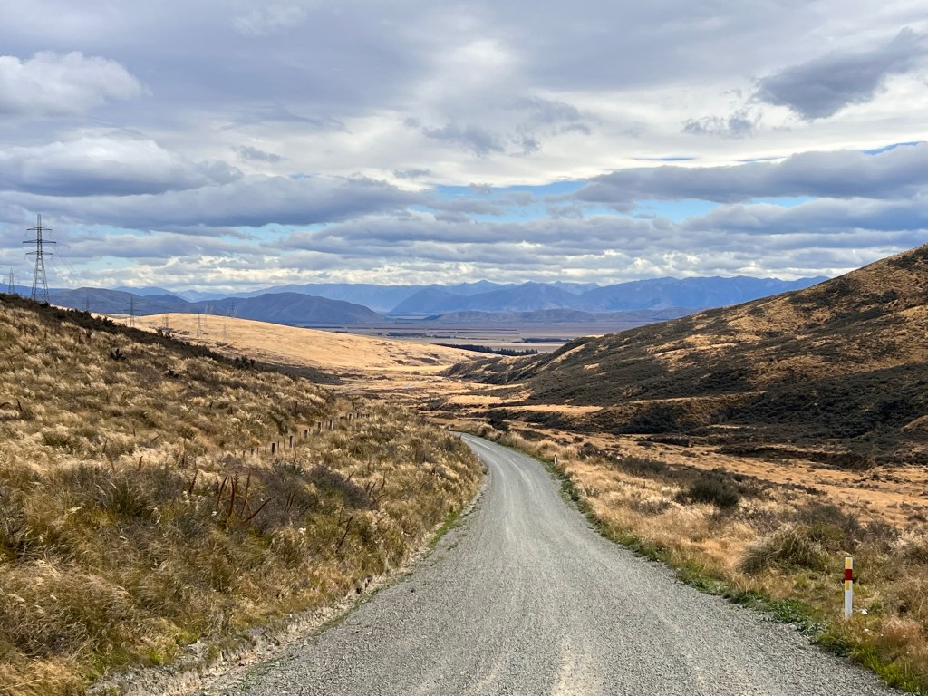 After descending off Rockwood Road it was more gravel heading out to Mackenzie Pass. The wind had started to pick up and I stopped for a bar about a km before the turnoff to McKenzie Pass. I followed a caterpillar tractor all the way up the pass. He had to go through creeks and gates to bypass the cattle stops. I started to wonder what would happen if he had tried a cattle stop? Would it disintegrate? Get stuck in the metal treads? The tractor was being driven by a boy who would have been late teens. We had a quick chat at the top of the pass. He was heading further up – looked like quite the adventure up a distant 4wd track.